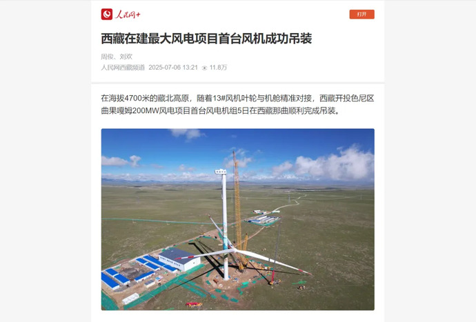 媒體報道丨西藏在建最大風(fēng)電項目完成首臺風(fēng)力發(fā)電機組吊裝